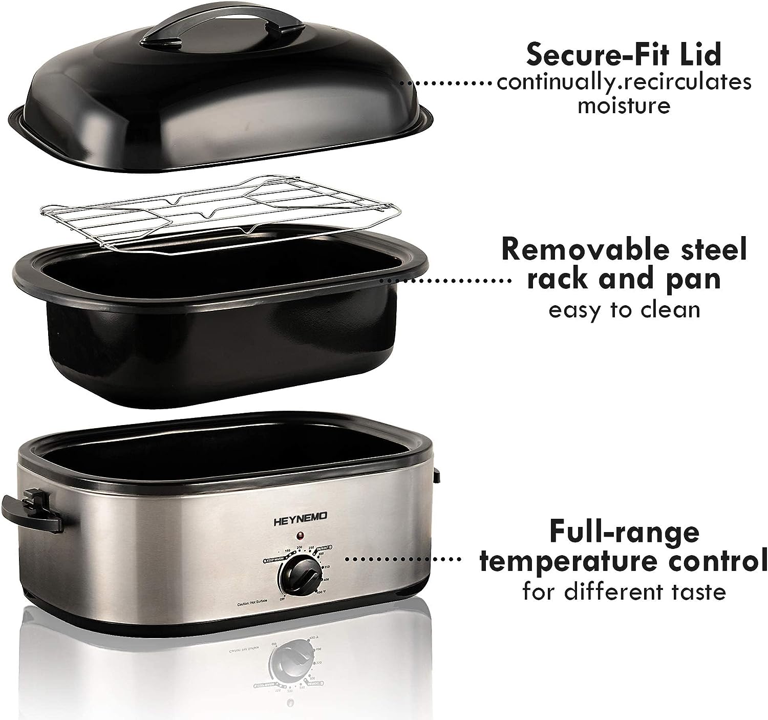 The versatile electric roaster bakes, slow cooks, roasts. Add more joy to your life. Self-Basting lid continually recirculates moisture, make the food more delicious. Full-range temperature control, warming setting keeps dinner at ideal serving temperature. Cool-Touch handles on the lid and body, can protect your hands. Removable insert pot, make it easier for you to clean it. If you have any question about our electric roaster bakes, welcome to contact us. We'll be happy to serve you.
