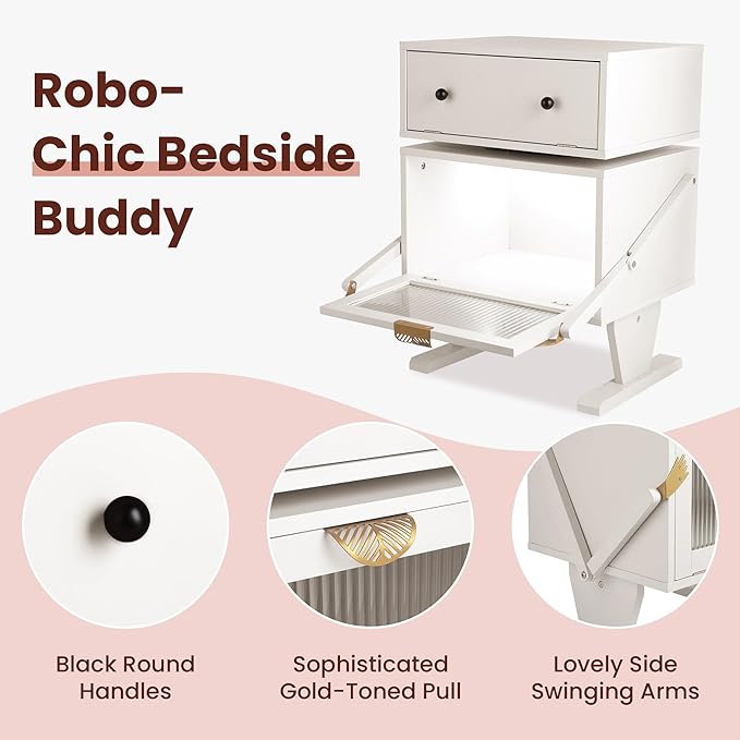Step into a world of enchantment with our creative nightstand. The rotating head and swinging arms bring whimsy to any room. Ideal for all ages, it seamlessly combines playful aesthetics with functionality. Spacious storage space shines with a 360¡ã rotating top drawer and a smoothly opening lower cabinet, effortlessly storing essentials. The cabinet door transforms into a convenient tray, enhancing daily convenience. Crafted from eco-friendly and robust materials, it offers durability and safety. Creating an inviting atmosphere with the LED light strip design in the lower cabinet, serving as the perfect bedside nightlight. This unique furniture effortlessly transforms into a bedside table, sofa-side companion, or storage cabinet for your home. Elevate your space with this captivating and functional addition.