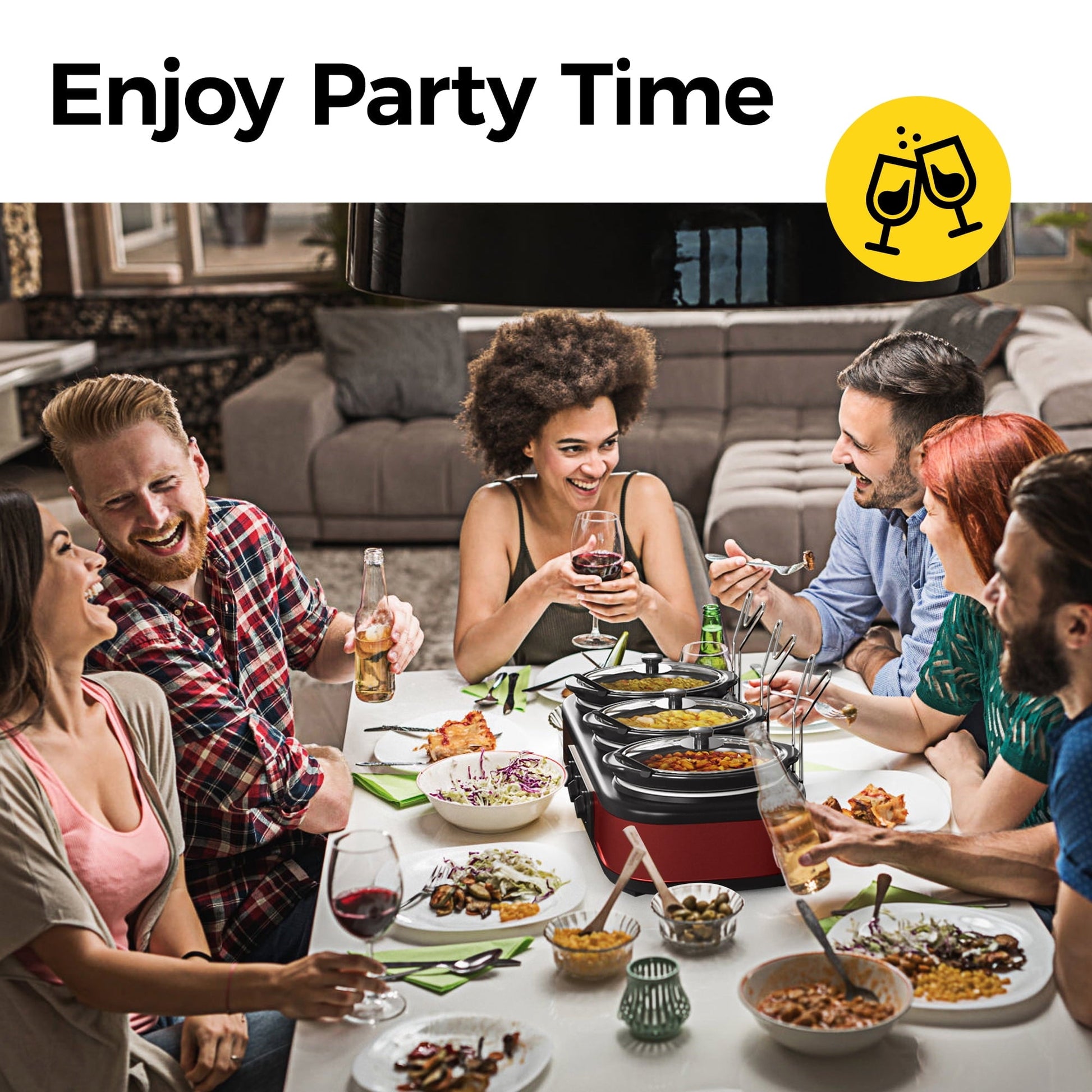 - Perfect for game night/football viewings/gatherings/house warming party as you can heat up different cheeses, fondue (dark, milk, white chocolate) and nacho bar ( cheese sauce, beans, beef)??