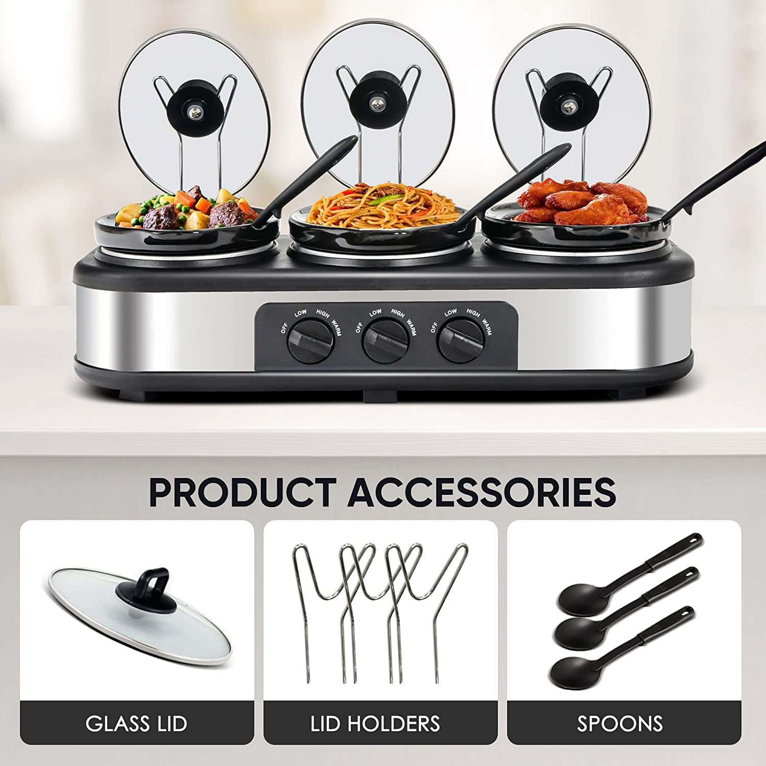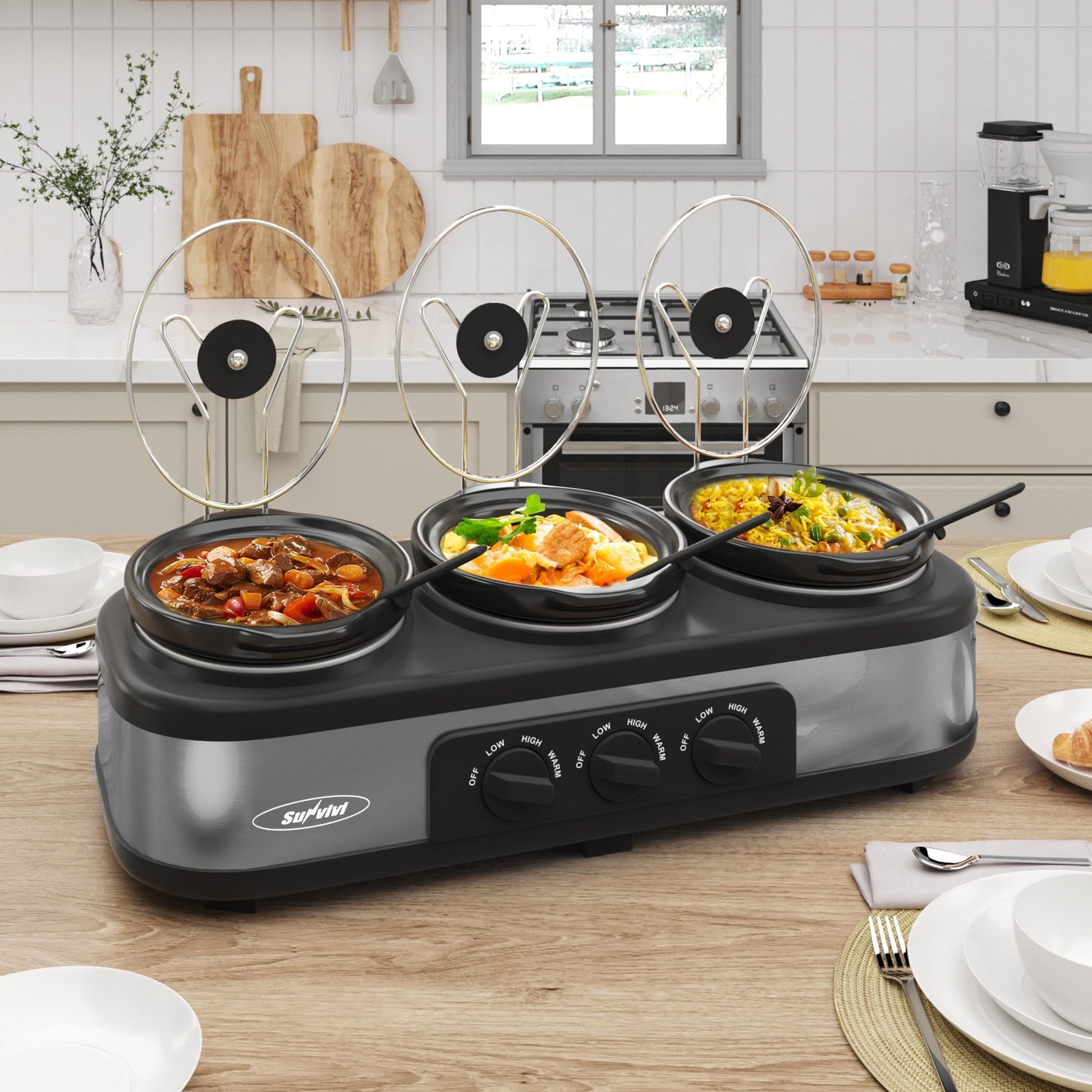 SUNVIVI double slow cooker is a kitchen appliance that can be used by anyone who enjoys cooking and wants to save time and energy. Two separate dishes can be prepared and served at the same time. Perfect for Meal sellers, Busy professionals and Health-consucious individuals. As a buffet warming server, it will be a welcome addition during any family gathering or holiday. The electric slow cooker features a non-stick, removable and stain proof stoneware crock insert ideal for easy prepping, serving and cleaning! There are 2 separate ceramic pots, allowing you to cook 2 different dishes at the same time. The two pot can be set to high, low temperature or keeping warm individually according to the ingredients you want to stew, ensuring your food cooked in the best cooking condition. The transparent lids allows you to view the condition of the food easily. The stainless steel pots are removable for easy cleaning. The lid and stoneware can be washed in the dishwasher or with hot, soapy water. This SUNVIVI 2 x 1.25 QT Crock Pot Food Warmer is ideal for office parties, family functions, and other social events, compact design perfect for camping, outdoors, etc..