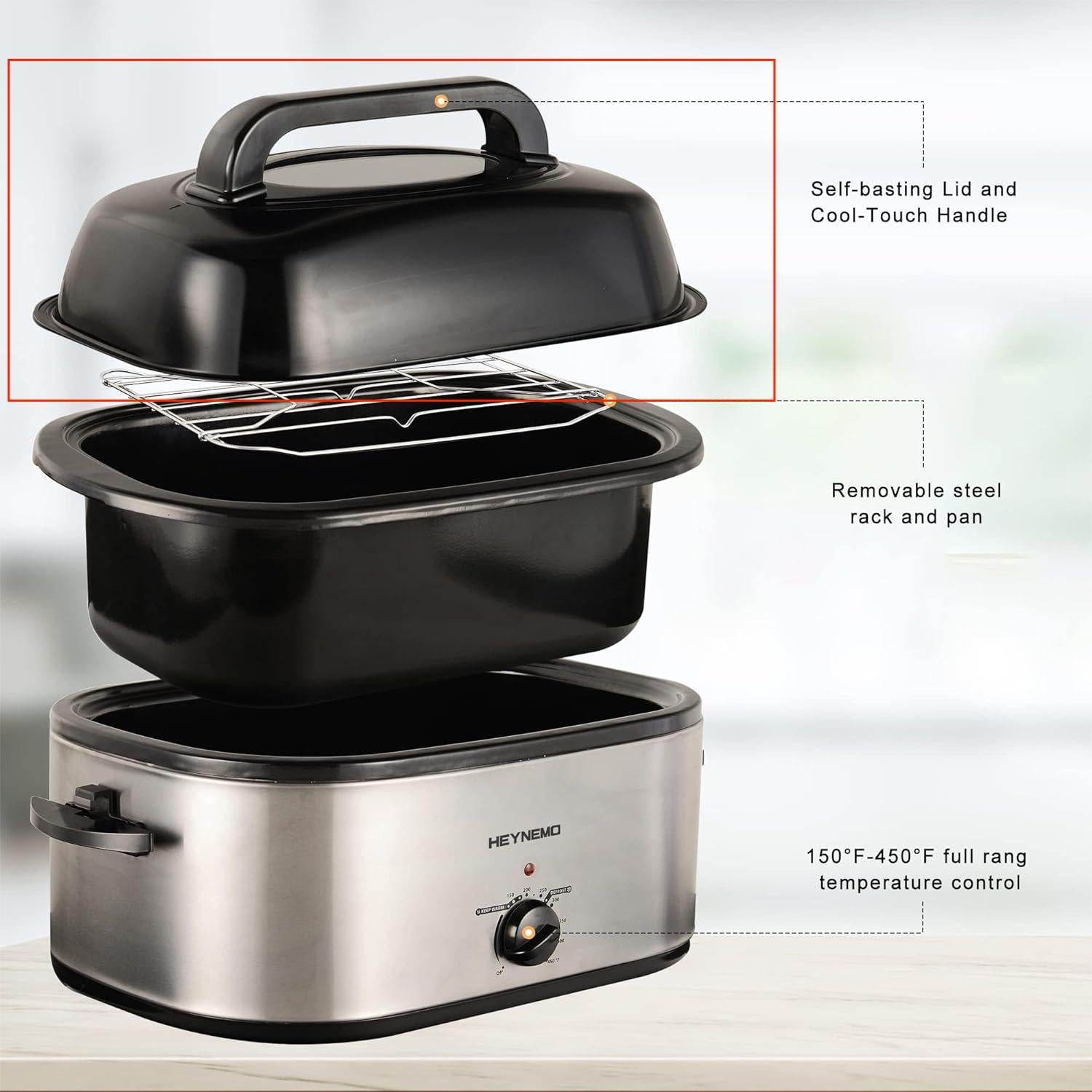 ¡¾Self-basting Lid¡¿Equipped with self-basting lid for convenient control for turkey, beefs or other meats, making a good color and taste turkeys, it cooks evenly without hot spots. Self-basting lid continually recirculates moisture, makes the meat tender and juicy, and does not stick to the pan.?(Note 18QT doesn't have the visiable window)