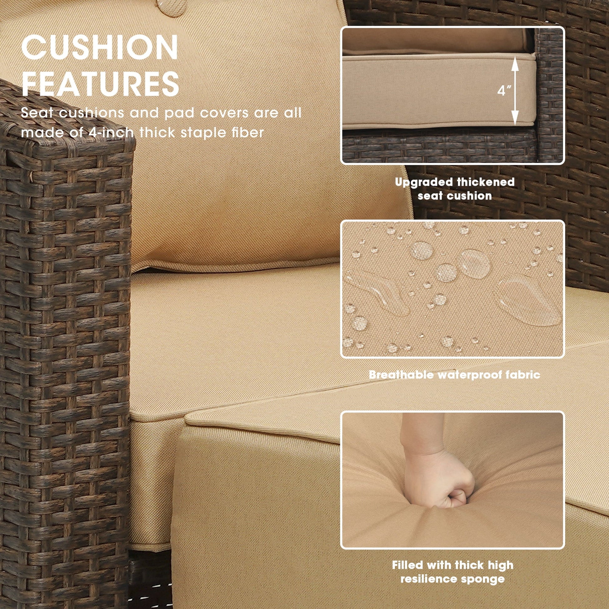- COMFORT UPGRADE: Our outdoor furniture set is with seat cushions of 3.54 inches , comfort upgrade and have good resilience. And provide proper support, so you won't feel tired after sitting on it for a long time. The seat cushion is very large and wide, providing a lot of space, It can accommodate people of any size to sit on it. Moreover, our sofa is designed with 16" backrest. The design of bent backrest makes you more comfortable to lean on the sofa and enjoy leisure time.