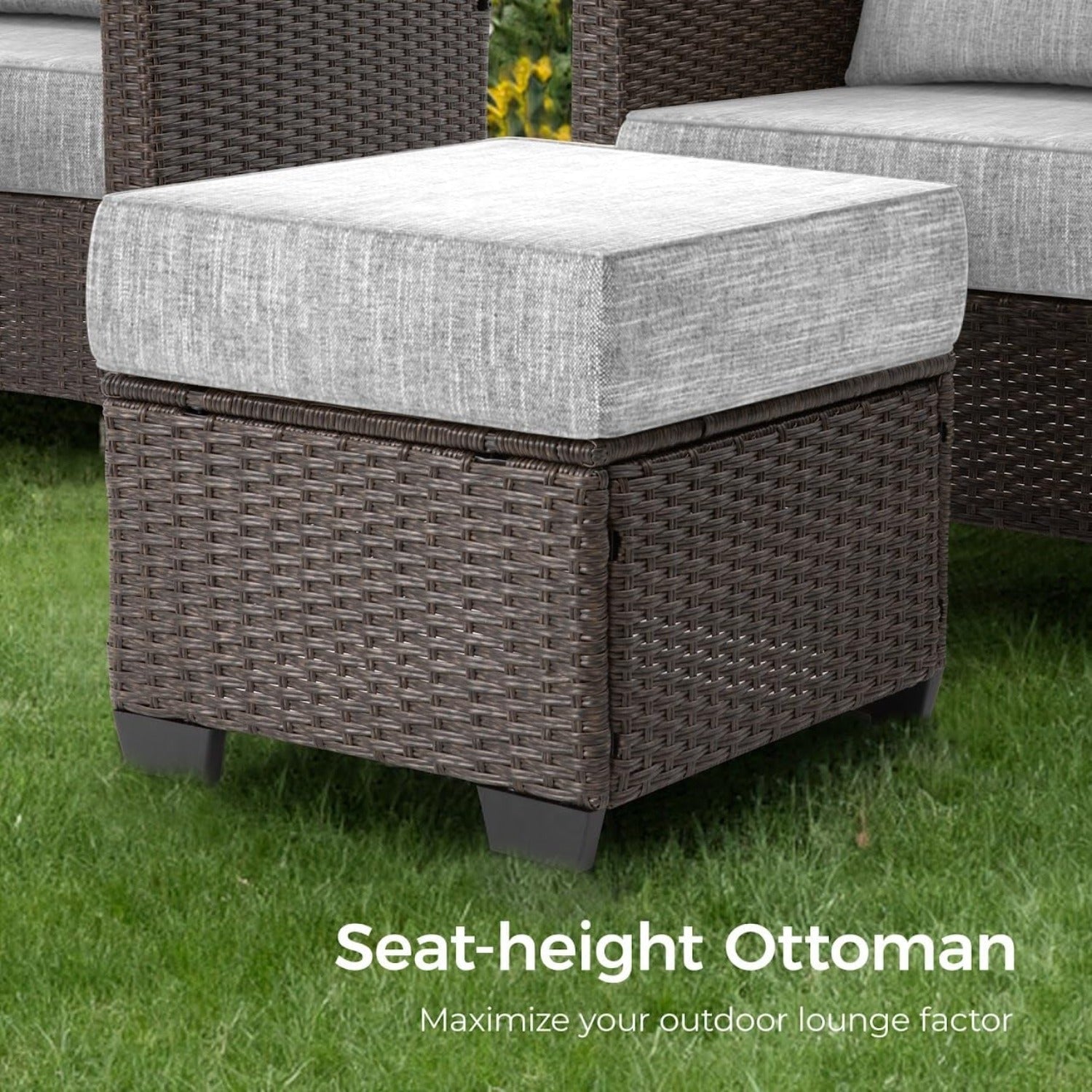 ?- Stylish Wicker Rattan: Featuring a delicate handwoven rattan pattern, this outdoor furniture set enhances your outdoor area with its elegant appearance, while it is strong enough to withstand all-weather variations for long service life.
