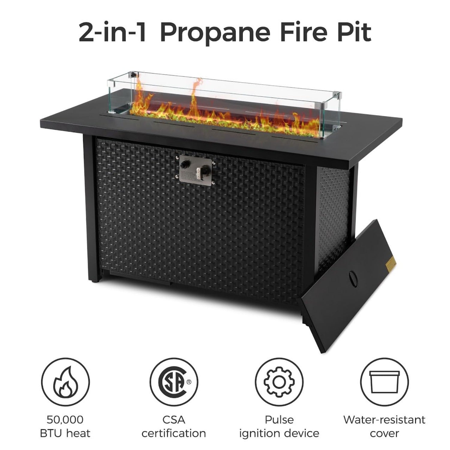 - 2 in 1 Fire Pit Table: Our outdoor fire pit table comes with a glass wind guard to protect the flames from wind. Certified by CSA, this fire pit generates 50,000 BTUs of heat, ensuring ample warmth and serving as a stylish outdoor decor piece.