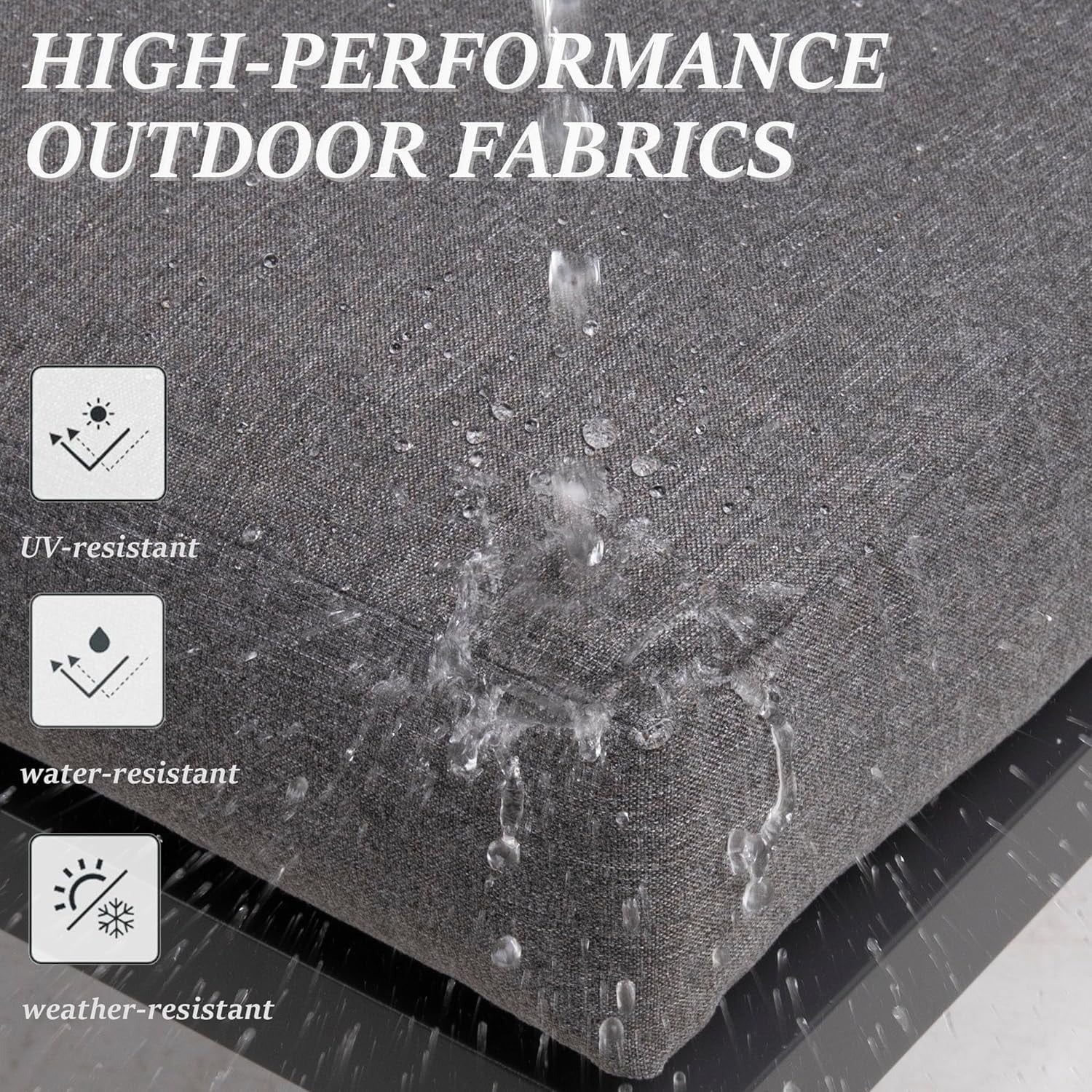 Elevate your patio or backyard with this durable and stylish aluminum outdoor bench. Featuring an upgraded aluminum frame, this metal patio bench is designed to withstand the elements and retain its sleek appearance. Say goodbye to rusting and fading. Sink into pure comfort with thick cushions, filled with high-density foam. And worry not about spills or stains, as the cushion cover is made from a durable polyester fabric that is waterproof and easy to clean with the convenient zipper. With stable U-shaped legs and adjustable feet, our modern outdoor bench is adaptable to uneven surfaces, perfect for any outdoor setting. Setting up your new favorite spot outdoors is a breeze with the easy-to-follow instructions included.?
