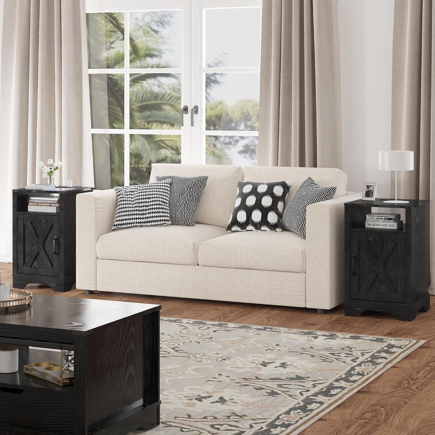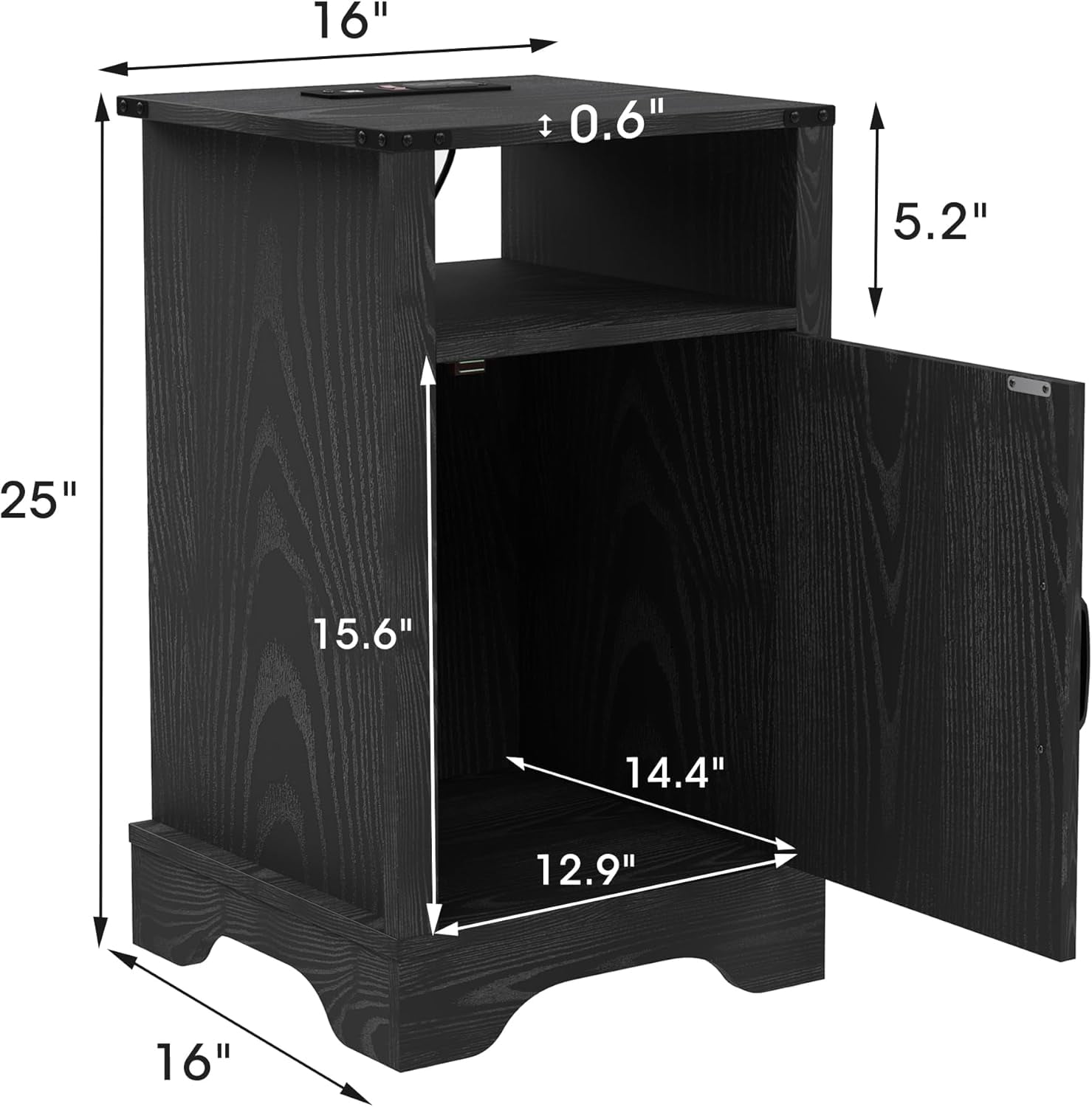 Superjoe Farmhouse Nightstand Set of 2 with Charging Station, Wooden End Table, Rustic Night Stand with Storage Cabinet and Shelf, Tall Bedside Table for Bedroom, Living Room, Black