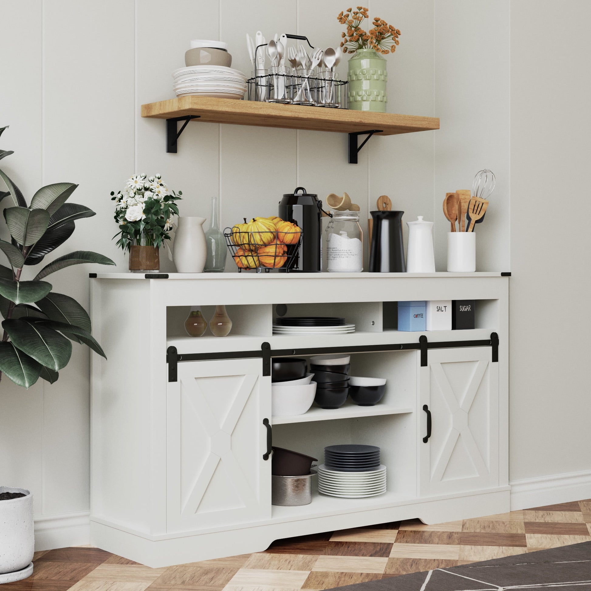 Who Knew Storage Could be So Stylish? With both open and closed compartments, the white tv stand got you covered. Show off your fancy decor on the central shelves, and get creative with custom storage using the three adjustable shelves inside. Imagine the entertainment center barn-inspired doors smoothly gliding along steel rails with exposed wheels, allowing a quick and easy access to all your gadgets, while secretly concealing the clutter we all try to hide. With a fresh and inviting vibe, the up to 70inch tv stand is sure to impress. And don't get us started on those X-shaped details on the cabinets - they add a touch of farmhouse flair that's hard to resist! It's the perfect addition to any rustic living space, taking it from ordinary to extraordinary.
