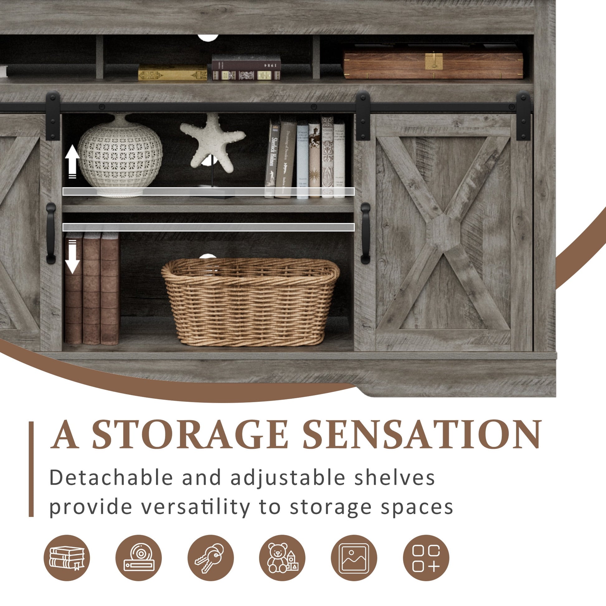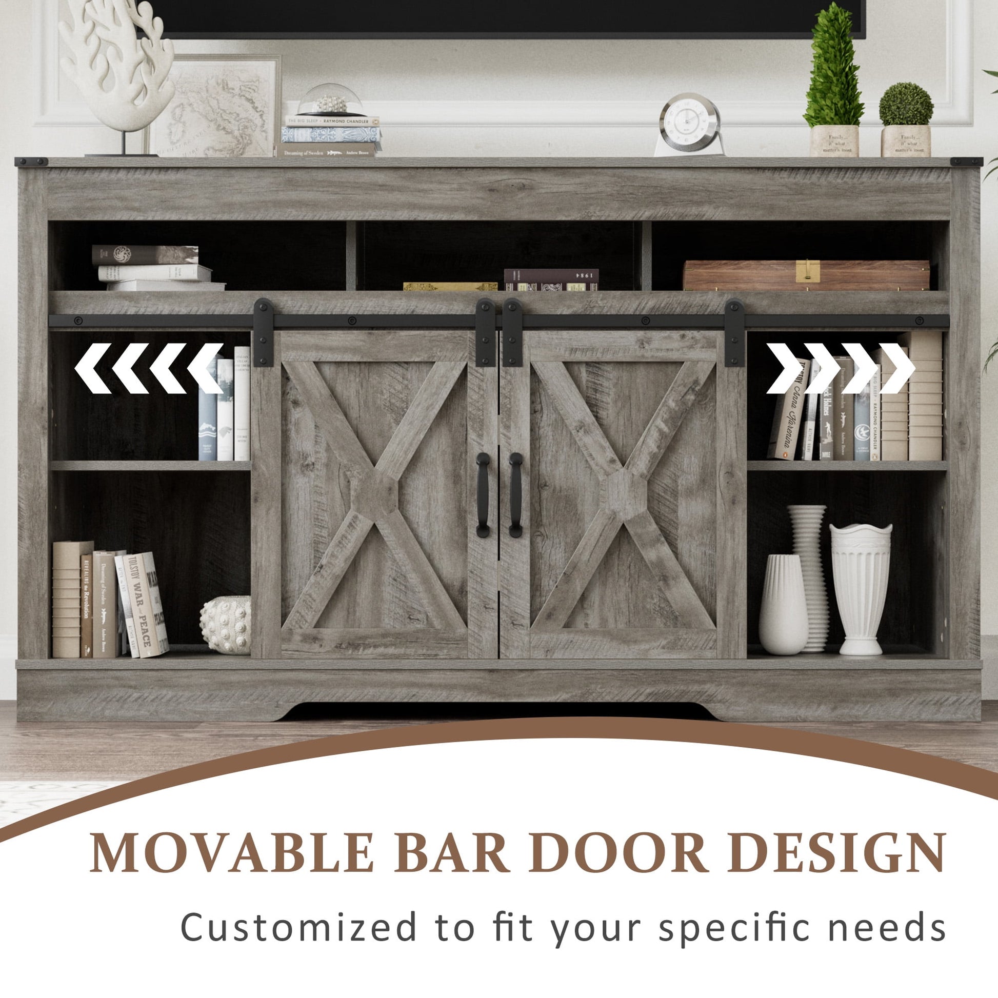 Who Knew Storage Could be So Stylish? With both open and closed compartments, the white tv stand got you covered. Show off your fancy decor on the central shelves, and get creative with custom storage using the three adjustable shelves inside. Imagine the entertainment center barn-inspired doors smoothly gliding along steel rails with exposed wheels, allowing a quick and easy access to all your gadgets, while secretly concealing the clutter we all try to hide. With a fresh and inviting vibe, the up to 70inch tv stand is sure to impress. And don't get us started on those X-shaped details on the cabinets - they add a touch of farmhouse flair that's hard to resist! It's the perfect addition to any rustic living space, taking it from ordinary to extraordinary.
