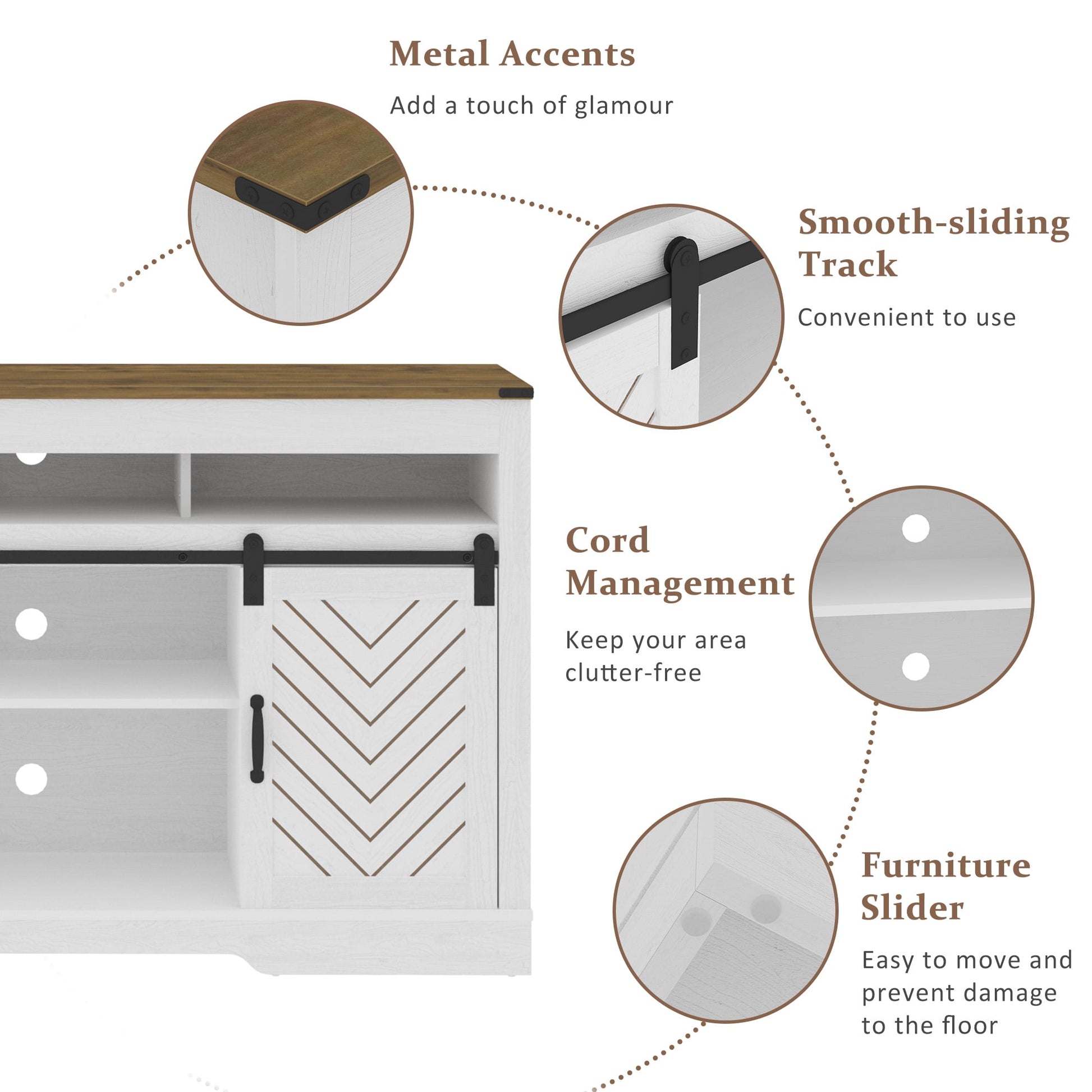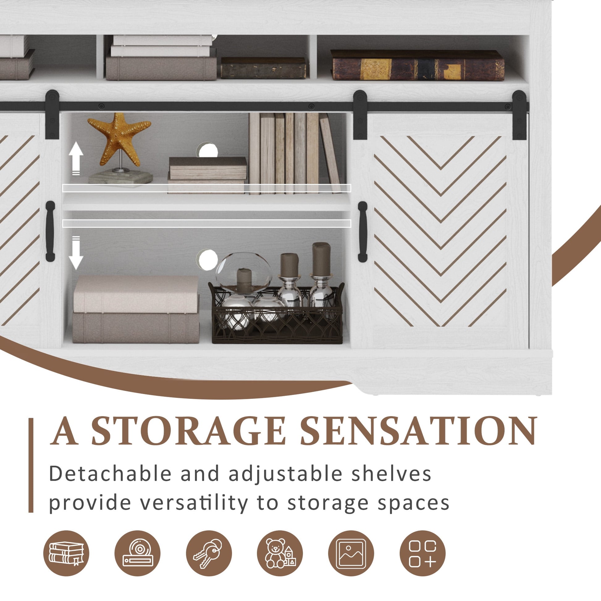 Who Knew Storage Could be So Stylish? With both open and closed compartments, the white tv stand got you covered. Show off your fancy decor on the central shelves, and get creative with custom storage using the three adjustable shelves inside. Imagine the entertainment center barn-inspired doors smoothly gliding along steel rails with exposed wheels, allowing a quick and easy access to all your gadgets, while secretly concealing the clutter we all try to hide. This console table is a real showstopper with its charmingly crisp white finish and natural pine-color top. It's the perfect addition to any rustic living space, taking it from ordinary to extraordinary.